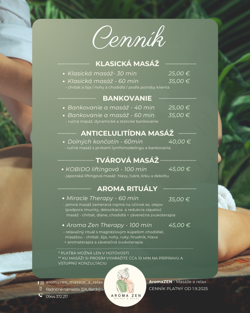 Predčasom som mala možnosť vyskúšať masáž v AromaZen a zapáčilo sa mi to tak, že som sa sem vrátila znova a znova sa aj vrátim. Veľmi milý prístup, zlaté ruky, masáže vždy prispôsobené mojim potrebám, utúlne a čisté prostredie. Človek si tu maximálne oddýchne, či už po fyzickej alebo psychickej stránke. Odporúčam všetkým určite budete spokojní